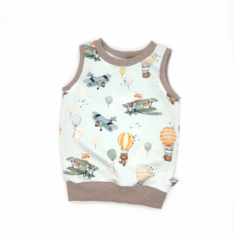 Egyrétegű rugalmas minttás szabadidő anyagból (futter) készült bebújós mellényke. Elején hátán ugyanaz a minta látható.