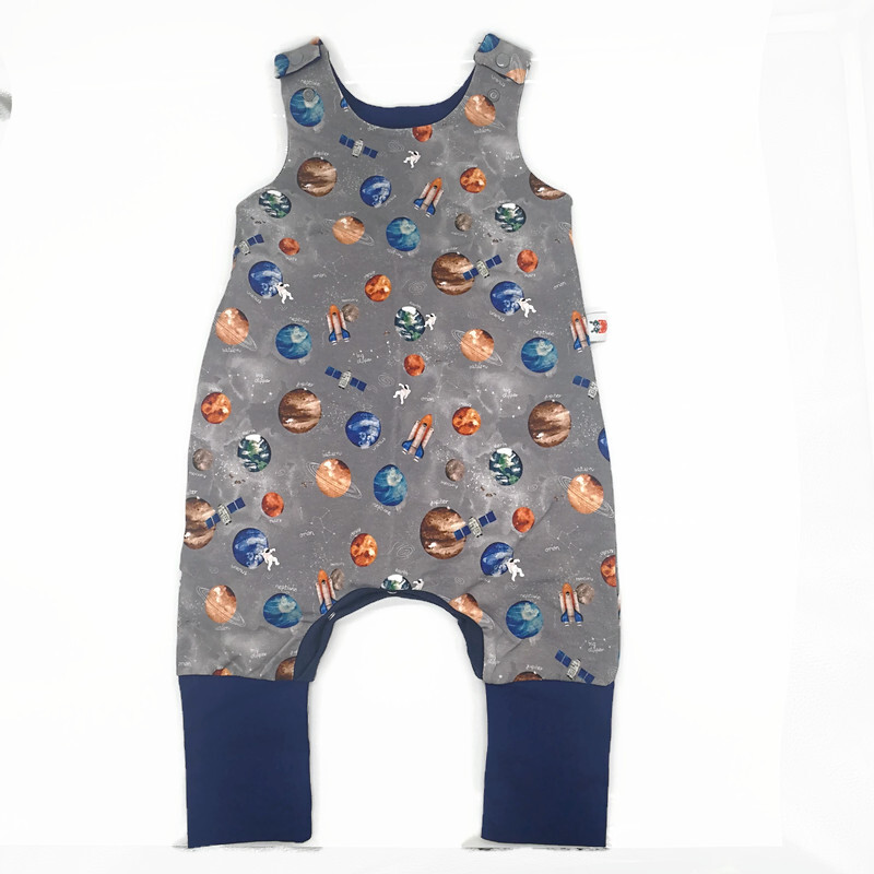 Rugalmas pamut futter-ből készült romper hosszú passzéval. Ez az anyag a melegítő/szabadiő anyagnak felel meg.