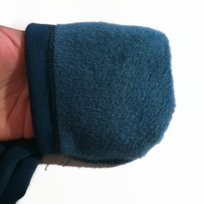 Alapanyaga: Alpenfleec – 65% pamut 35 % poliészter ami a rugalmasságot biztosítja, viszont tilos szárítógépbe tenni illetve ajánlott 30 fokon mosni.  (fotón látható a belseje)