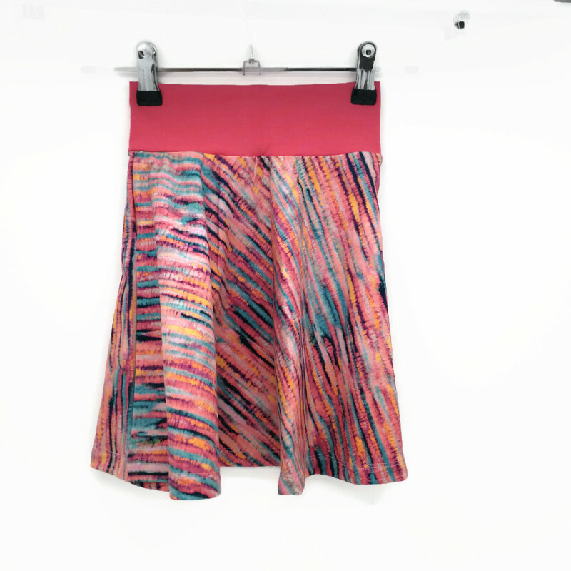 Rugalmas anyagból készült pörgős szoknya, passzés derékkal.