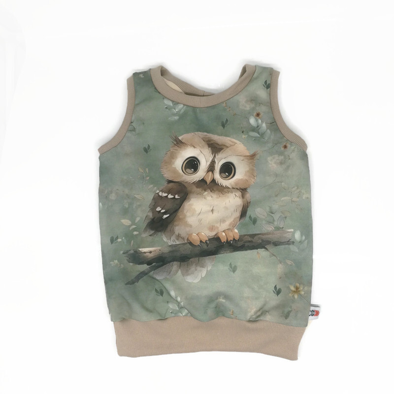 Egyrétegű rugalmas minttás szabadidő anyagból (futter) készült bebújós mellényke. Elején egy nagy minta látható hátán a minta nélüli része látható.