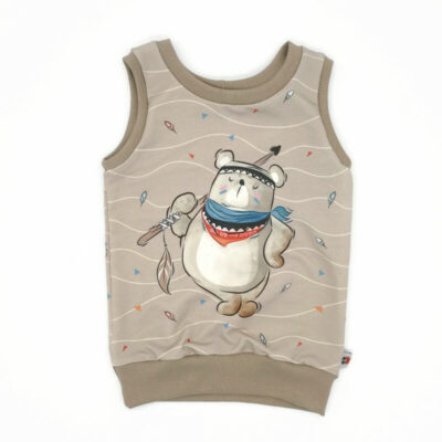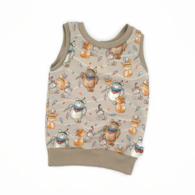 Egyrétegű rugalmas minttás szabadidő anyagból (futter) készült bebújós mellényke. Elején egy nagy minta látható hátán is az adott minta kisebben látható.
