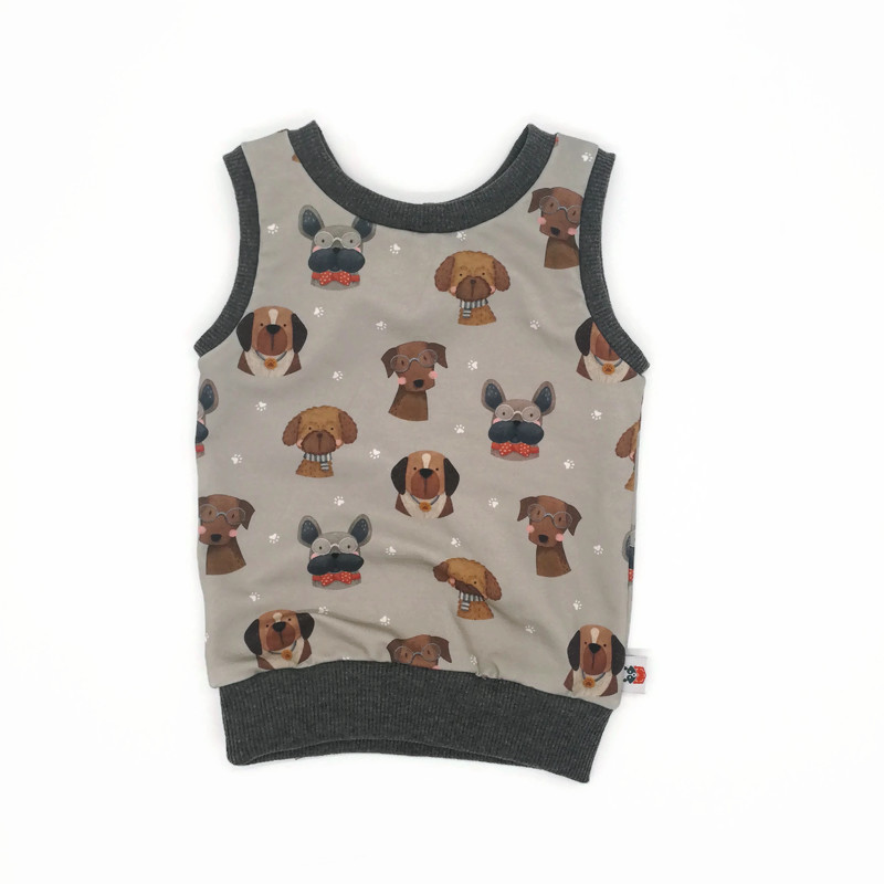 Egyrétegű rugalmas minttás szabadidő anyagból (futter) készült bebújós mellényke. Elején egy nagy minta látható hátán a minta nélüli része látható.